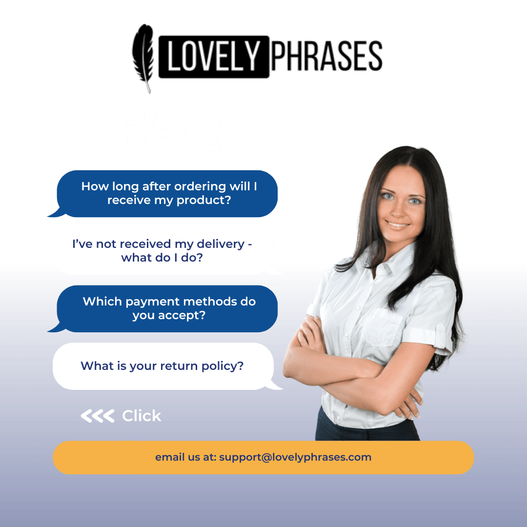Items returned to us without first requesting a return will not be accepted. You can always contact us at support@lovelyphrases.com with any return questions.